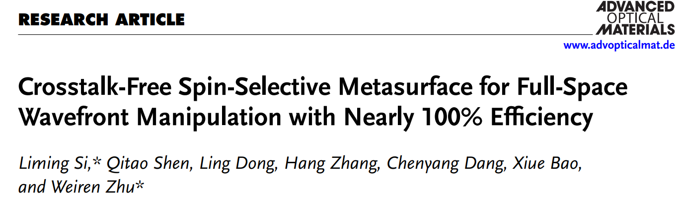 文章信息:Liming Si*, Qitao Shen, Ling Dong, Hang Zhang, Chenyang Dang, Xiue Bao, Weiren Zhu*, “Crosstalk-free spin-selective metasurface for full-space wavefront manipulation with nearly 100% efficiency”,Advanced Optical Materials, pp: 2501041, 2025.