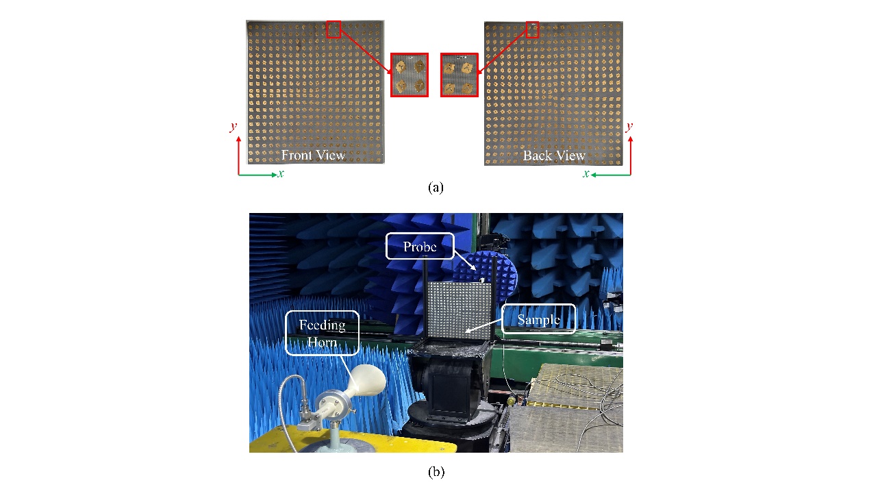 极化选择超表面作为实现多功能、高精度电磁波调控的核心技术之一,近年来在智能通信、信息处理与新型雷达系统等前沿领域受到广泛关注。然而,当前技术方案普遍面临能量利用效率不高、通道间极化串扰严重等关键瓶颈,极大限制了其实用化和系统集成能力。为解决这一难题,司黎明教授课题组成功设计并实现了一种工作于X波段的新型高效率全空间极化选择超表面。该超表面通过引入几何相位与传播相位协同调控机制,突破传统多层堆叠与结构复杂限制,显著提升了系统整体性能。实验证明,该超表面不仅能够在反射与透射模式下分别实现不同的轨道角动量调控(OAM)——反射模式下模态 𝑙=+1 的纯度高达 90.08%,透射模式下模态 𝑙=+2 的纯度则达到 95.51%,还实现了近100%的超高效率全空间调控能力,实测效率高达97%。该超表面架构高度集成、结构紧凑,可实现双通道涡旋波的高效复用与解复用,展现出全空间、无串扰、高效率的电磁波波前控制能力。有望在高容量通信系统中展现显著优势,并在无人机、自动驾驶及电磁空间信息传输等前沿领域拥有广阔的应用前景。