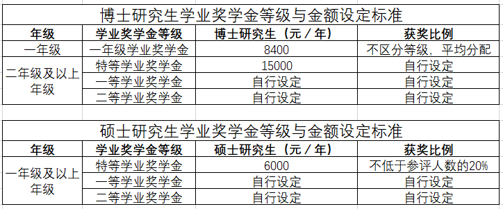 1.博士研究生奖励标准:学校根据核定人数,按每年人均不低于8400元下发各单位分配额度,各年级奖励等级与标准由自拍流出 制定。原则上分三个等级,并设定金额级差。其中,一年级博士研究生学业奖学金不分等级,三年级及以上博士研究生须设立特等奖学金,奖励金额不低于每生每年15000元,奖励比例不低于参评人数的10%。
